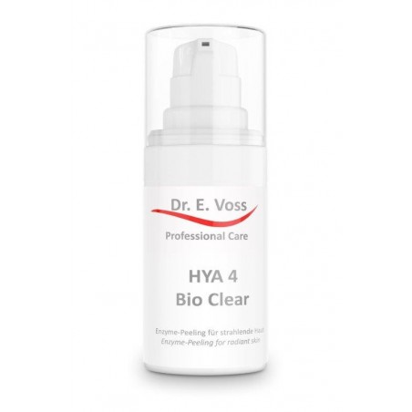 HYA 4 BIO CLEAR je encimski piling, ki naredi kožo bolj gladko in sijočo, saj nežno razgrajuje odmrle celice rožene plasti kože. Vsebuje peptid (polimerno proteazo), ki je vezan na dolg polimer in se ne absorbira, temveč ostane na površju. Ta peptid razgradi mrtve keratinocite (keratinske luskice), hialuronska osnova gela pa nežnemu, a izjemno učinkovitega »leave on« pilinga, doda še vlažilno negovalno komponento. Rezultat, ki je viden že po prvem nanosu, je žametna, mehka in sijoča koža.